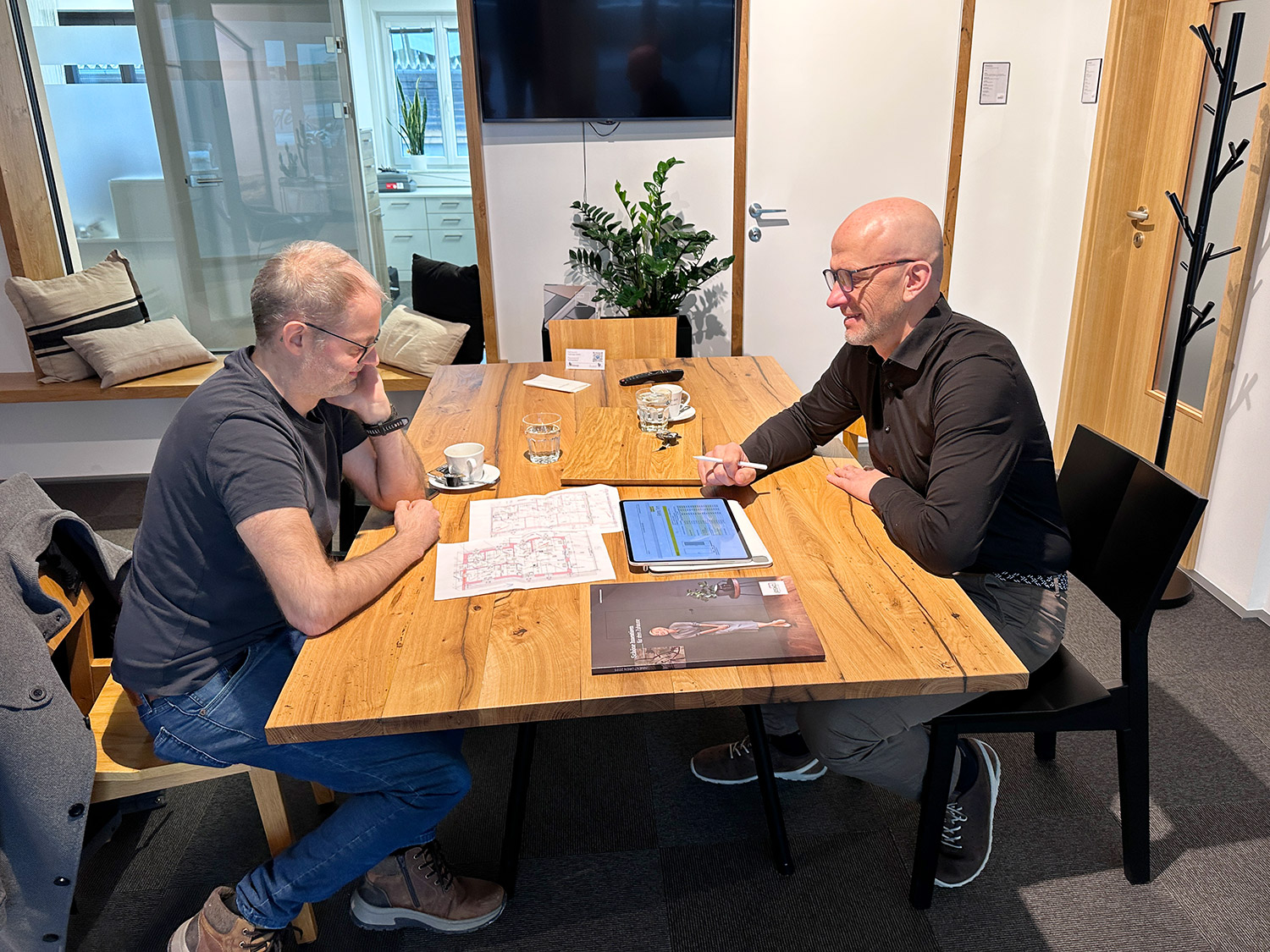 Entscheiden sich Kundinnen und Kunden für eine Zusammenarbeit, bleibt die beratende Person während des gesamten Projekts eure zentrale Ansprechperson. Auf Wunsch erfolgt auch die Abstimmung mit dem Baumeister oder anderen Gewerken. Technische Daten und relevante Informationen werden koordiniert weitergegeben, sodass alle Beteiligten auf dem gleichen Stand sind.